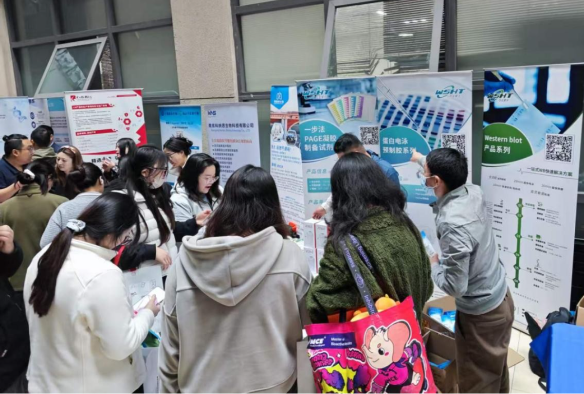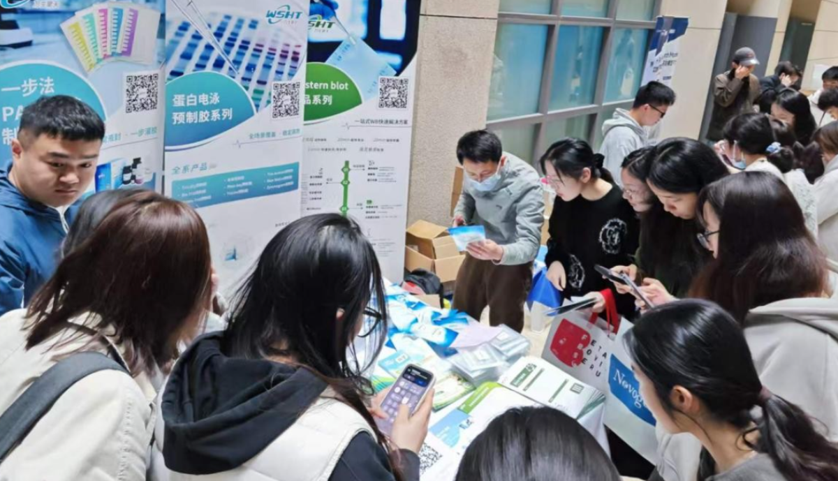 展会现场,万生昊天展位前人头攒动,成为全场焦点之一。我们的蛋白预制胶系列与WB快速解决方案产品,吸引了众多老师与同学的浓厚兴趣。